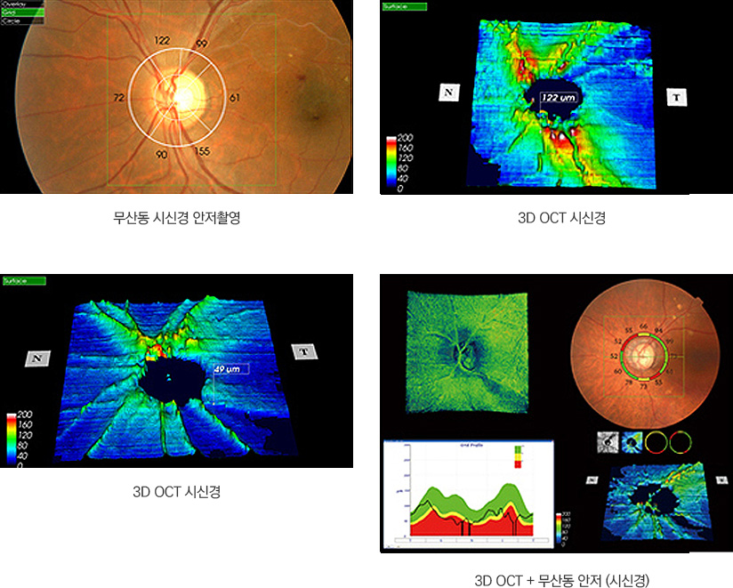 본 안과에서 도입한 일본 TOPCON사의 3D OCT-2000은 무산동 안저카메라 기반에 최신 SPECTRAL DOMAIN OCT 기술을 조합하여 무산동 촬영과 OCT촬영이 동시에 가능하여 환자검사 시간이 단축될 뿐만 아니라 한차원 높은 단층촬영과 판독시 안저 이미지와 OCT이미지를 동시에 비교 분석하여 판독할 수 있는 장비입니다. 무산동 안저 촬영을 통해 망막질환부의 정확한 위치와 전체적인 시신경 섬유측의 결손유무를 파악하여 녹내장 유무를 판독하여 수개월 수년뒤에 볼 수 있는 시력저하 또는 시력손실까지 예방할 수 있습니다.