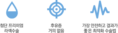 즉, 기구를 인한 감염이나 안구건조증 등의 후유증이 거의 없고 개인별 검사결과에 맞춰 가장 안전하게 수술하고 가장 좋은 결과를 얻을 수 있도록 최적화 된 수술법 입니다.
